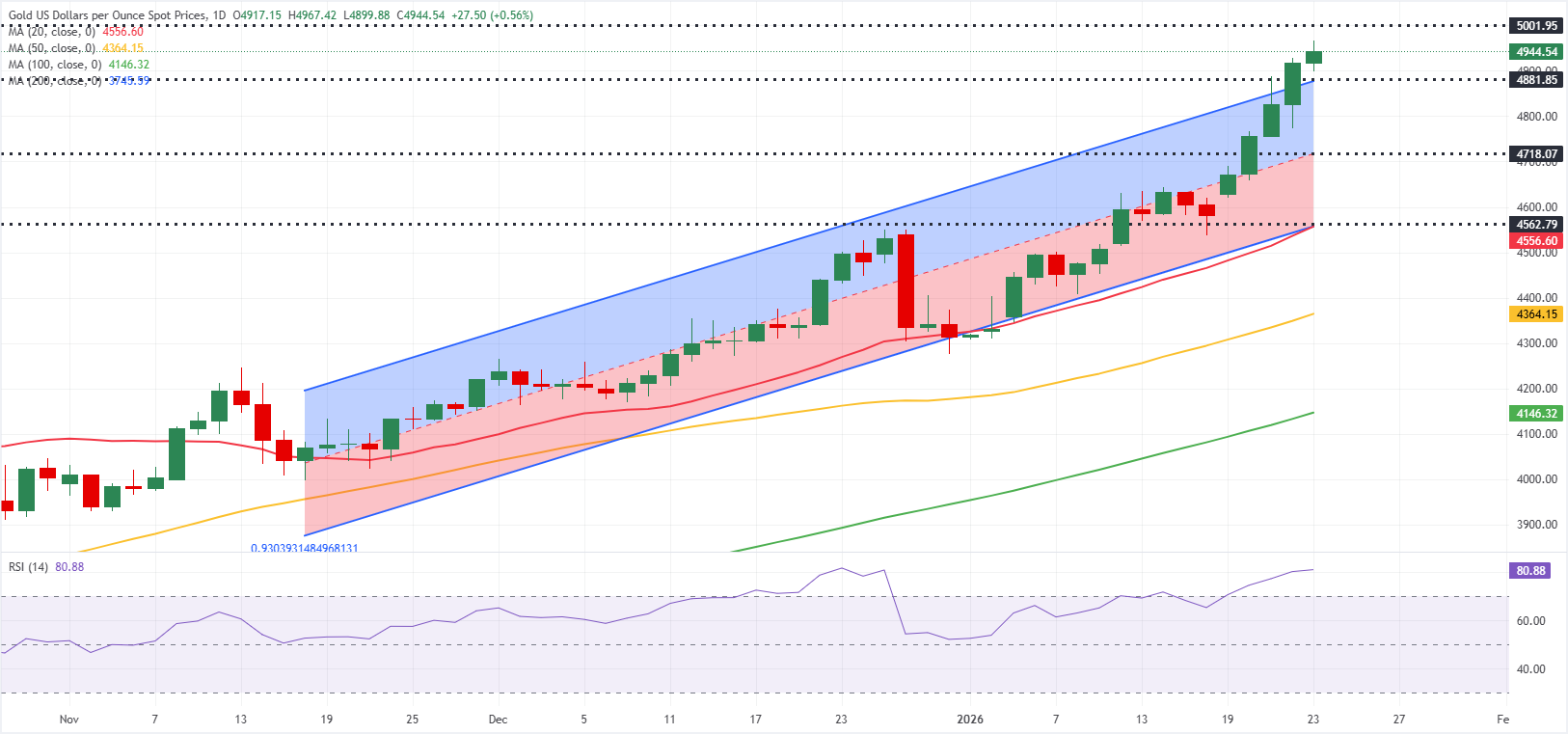 金價在週五早些時候飆升至接近每盎司4,970美元的新紀錄,為潛在的5,000美元測試保持了開放的可能性。美國美元的價格行動混合,加上整體國債收益率的下跌,支撐了這種貴金屬在本週末的反彈。