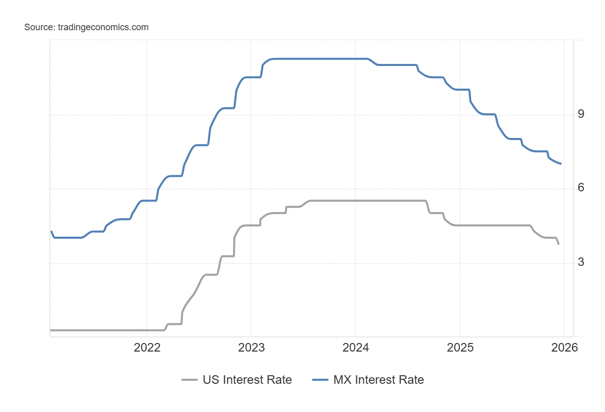 因此,如果日本央行在2026年上半年採取比預期更鷹派的立場——即提高利率使日本資產更具吸引力——投資者可能會將資金從墨西哥等新興市場撤出。這可能導致墨西哥比索貶值,並因外匯波動增加而減少套利交易收益。