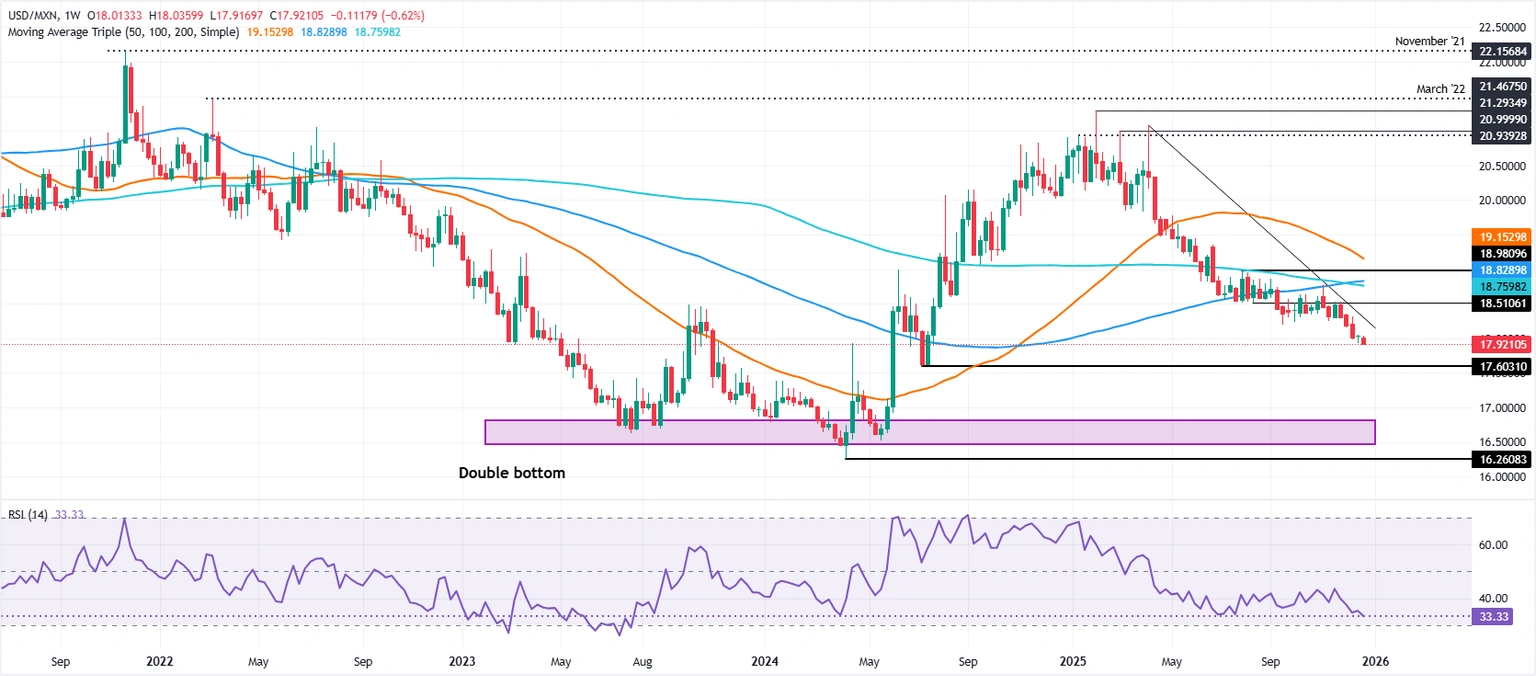 從周線圖角度看,美元/墨西哥比索的技術圖景表明,在跌破位於約18.82-18.75區域的100周和200周簡單移動平均線交匯處後,下行趨勢有望延續,這為跌破18.50、進而延伸跌勢至18.00關口下方掃清了道路。