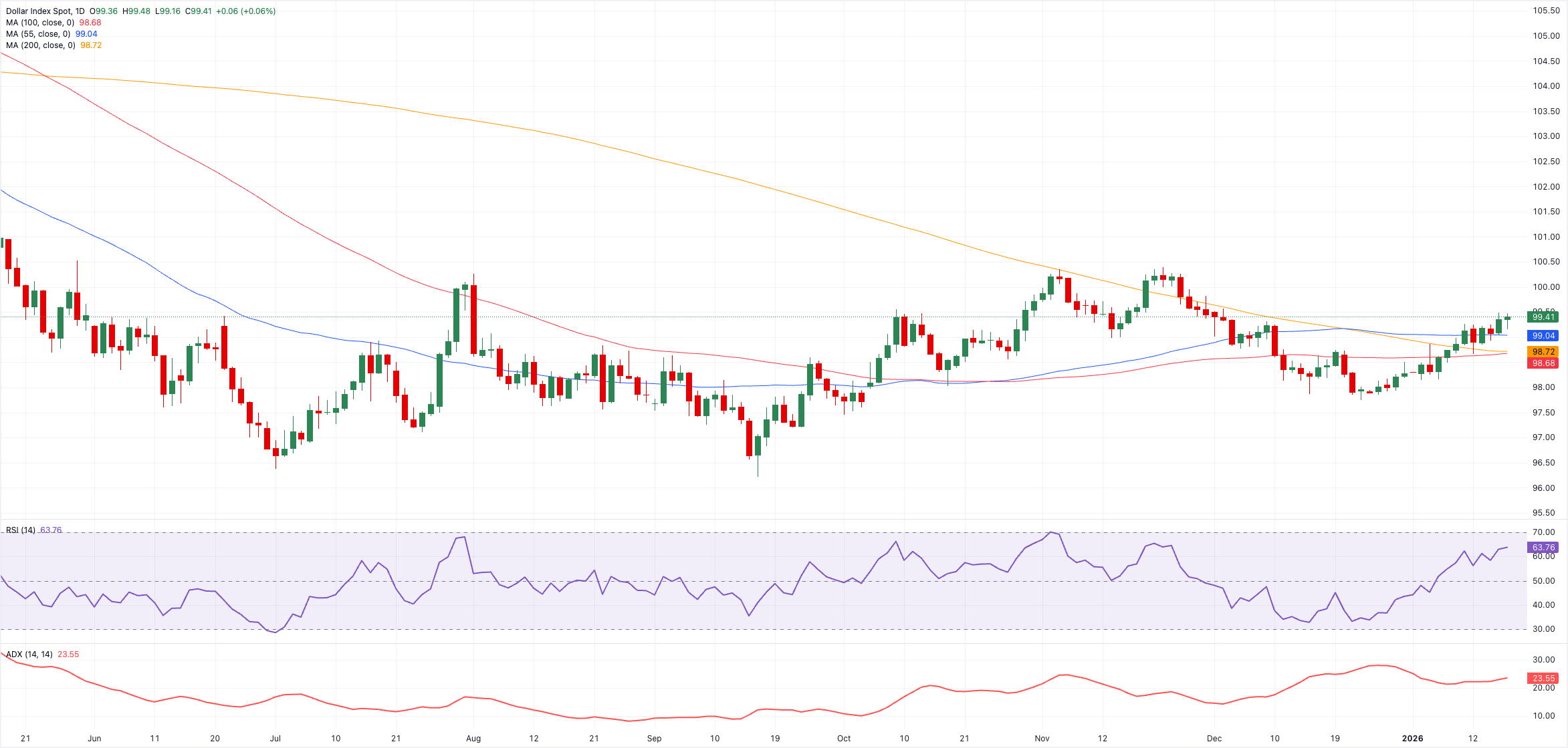 在12月24日觸底約97.70後,美元指數(DXY)已出現強勁反彈。此次反彈使DXY不僅重新回到99.00關口,還果斷突破其關鍵的200日簡單移動平均線(SMA),該線位於98.70附近。