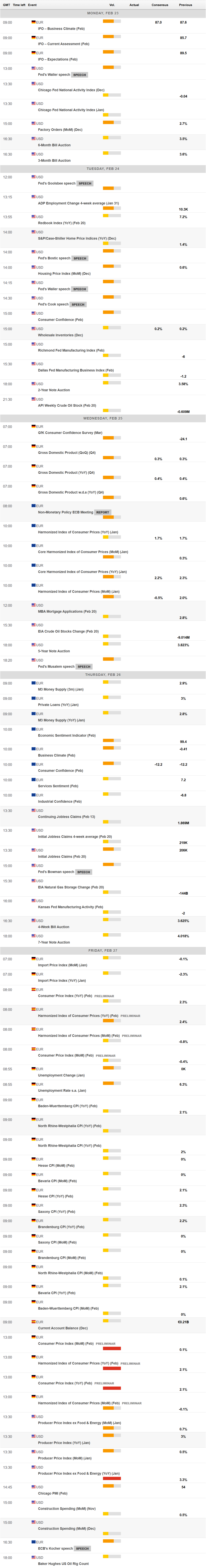 2月份的最後一周在一線數據方面將較為清淡。美國將發布1月份生產者物價指數(PPI)數據,而德國將公布2月份消費者物價調和指數(HICP)的初步估計。