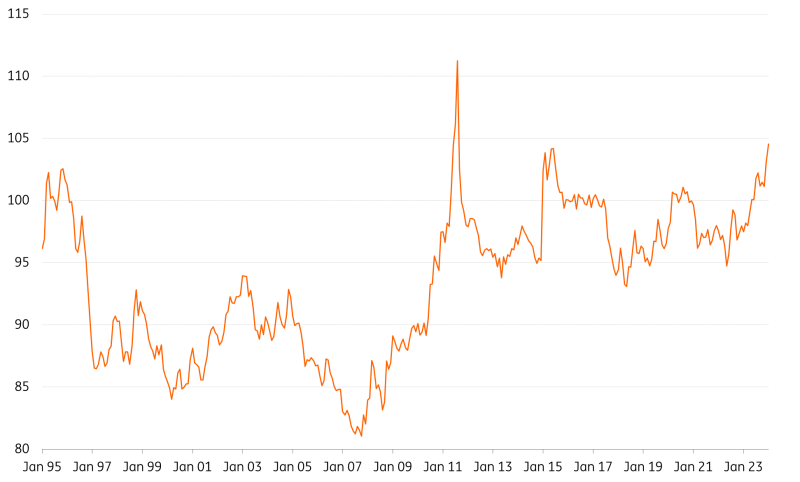實際上,2022年和2023年——瑞士央行積極尋求名目瑞郎升值以對抗通膨——是瑞士央行的例外。通常情況下,瑞士央行幾十年來一直在與瑞郎的強勢作鬥爭。但在2022年和2023年,為了讓瑞郎名義升值,瑞士央行分別賣出了220億瑞郎和1,330億瑞郎的外匯。我們懷疑今年情況發生了變化,2024年第一季外匯幹預數據可能會顯示瑞士央行在6月底發佈時回歸更典型的外匯買家趨勢。