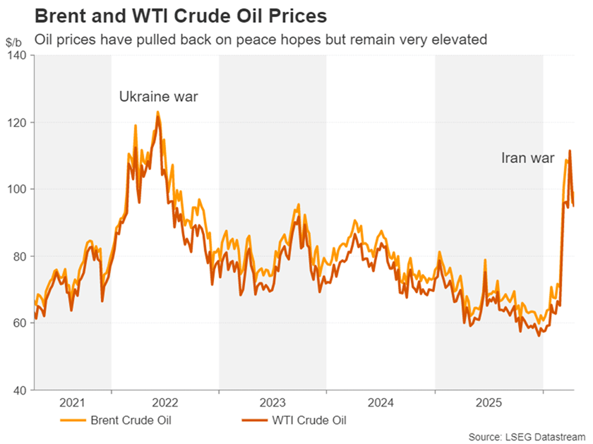 未來幾天和平進程的任何挫折都可能輕易將油價推回100美元以上。然而,股市面臨更大調整風險,華爾街在尚未達成永久結束中東衝突協議之前,已創下新高。