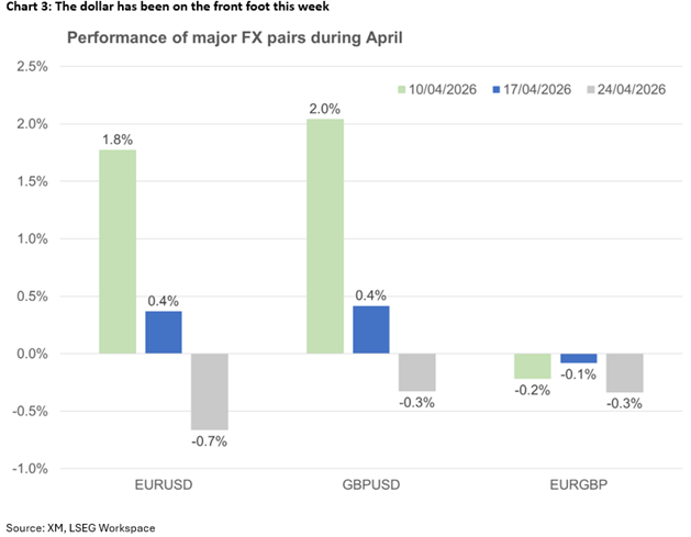 經歷了4月上半月美元對歐元和英鎊顯著表現不佳後,本週美元表現明顯改善,受益於中東談判缺乏進展。截至發稿時,美元指數自週一開盤以來上漲0.8%,扭轉了上週的跌勢。