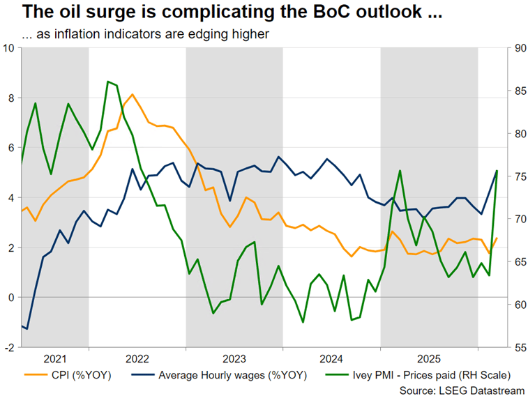 由於風險偏好改善以及油價上漲,商品貨幣表現優於美元。就加元而言,油價上漲是其表現的推動力。然而,在加拿大央行週三會議前,增長擔憂仍可能壓過通脹激增。預計不會調整利率,但3月疲軟的Ivey採購經理人指數可能迫使加拿大央行成員避免發表鷹派言論。在這種情況下,加之中東地區的負面消息,美元/加元當前的上漲走勢可能延續,1.3800將成為下一個關鍵阻力位。