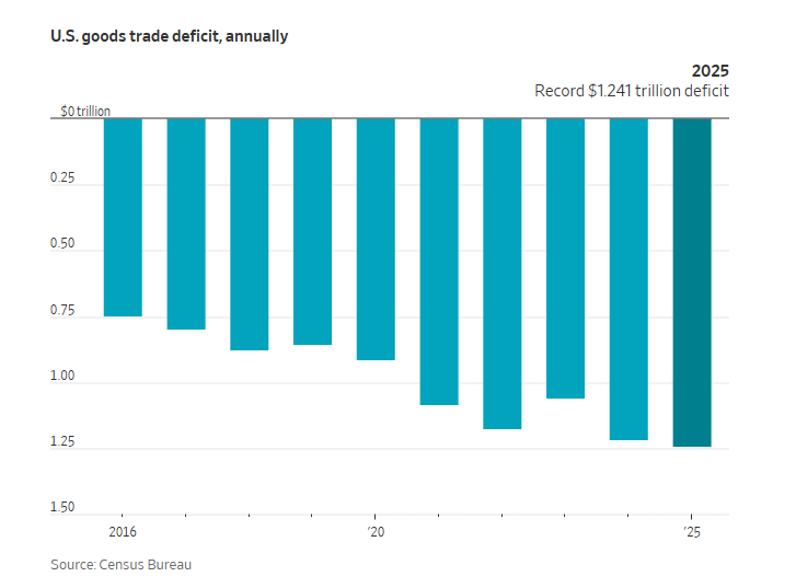 最後,值得一提的是,自2012年以來,美國貿易赤字呈指數級增長,根據美國經濟分析局的數據,在特朗普的關稅生效前,2025年第一季度的季節性調整年率達到了1.37萬億美元。此後赤字有所改善,但在2026年初遭遇重大挫折,特朗普將其歸咎於10月的停擺。