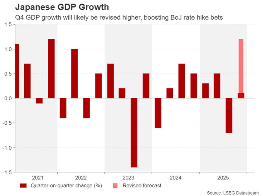然而,如果即將發布的數據(均定於周五)令人失望,寬鬆預期可能會得到增強,進一步加重英鎊在美元復甦中的困境。數據將包括1月份的月度GDP讀數,以及工業生產和貿易數據。