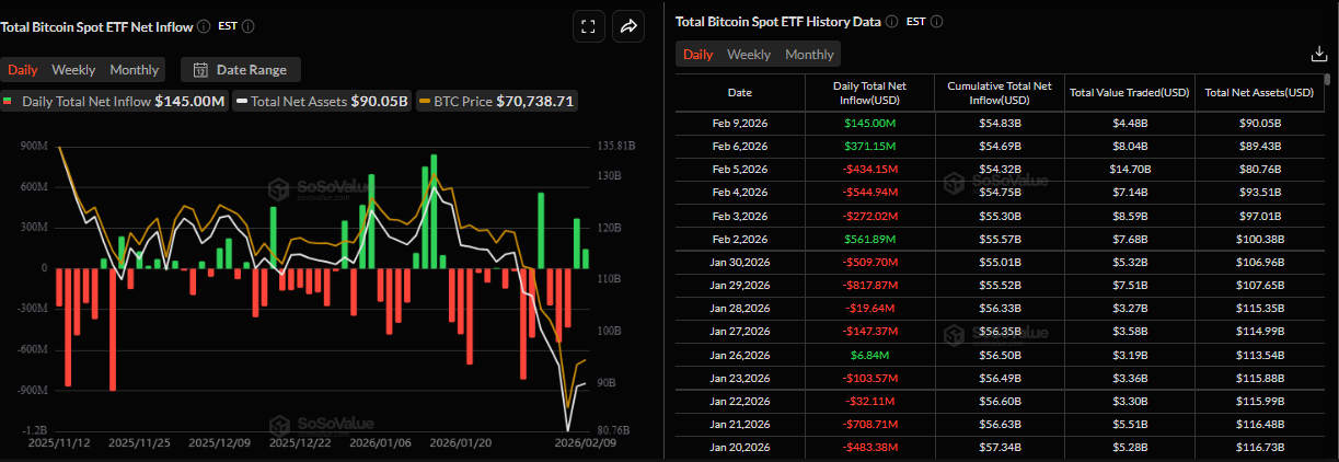 機構需求顯示出溫和的復甦跡象。根據SoSoValue的數據,現貨比特幣交易所交易基金(ETF)在週一錄得1.45億美元的溫和流入,標誌著繼週五的3.7115億美元流入後的連續第二天流入。如果這種流入持續並加劇,BTC可能會看到一些復甦。