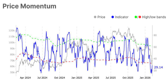 Glassnode在週一發布的每週報告強調,動能已從深度超賣水平改善,14天相對強弱指數(RSI)反彈至其下方統計帶,信號顯示賣壓緩解和買方的試探性參與,如圖所示。