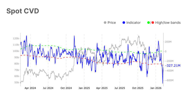 然而,下面的現貨交易量圖表顯示,交易量大幅擴大,但活動仍然是反應性的而非建設性的,反映出在下行重新定價後的波動,而非決定性的積累。