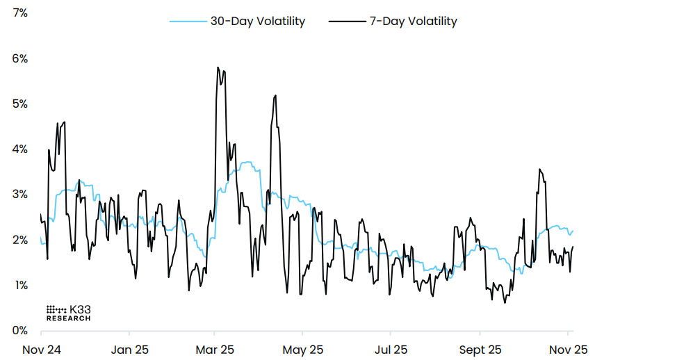 K33研究報告指出,比特幣最近的價格修正以穩定、有序的方式進行,沒有出現短期波動的顯著激增。
