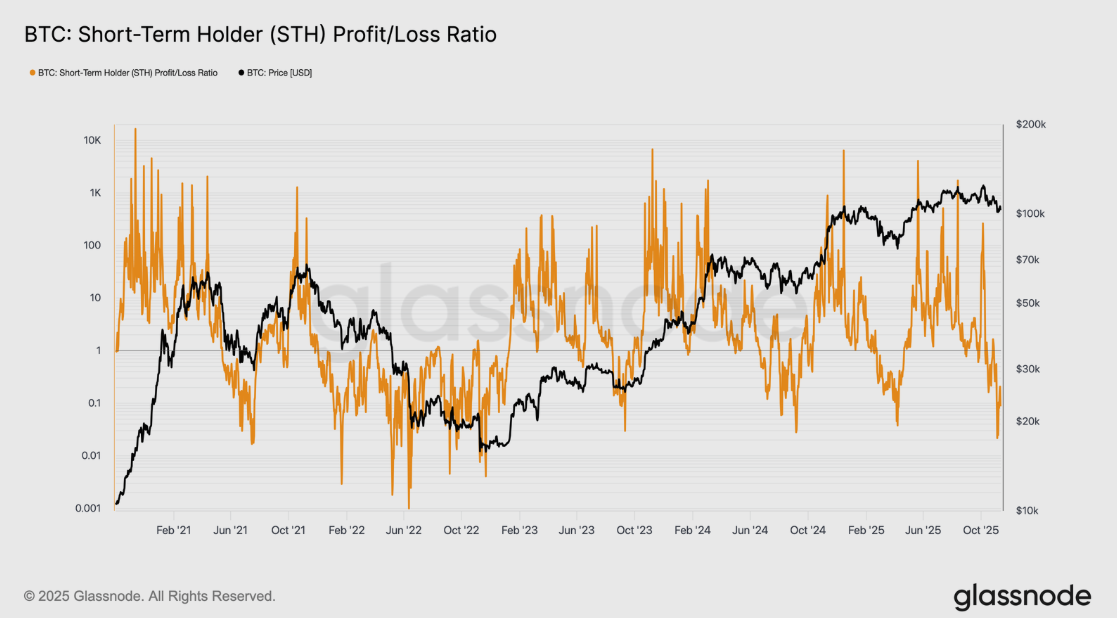 如下圖所示,比特幣測試了98,000美元,短期持有者實現的利潤-損失比率降至0.21以下,表明超過80%的實現價值來自於以虧損出售的幣。這種拋售強度短暫超過了本周期的最後三次重大洗盤,突顯出市場的頂部沉重以及100,000美元水平對近期穩定的重要性。
