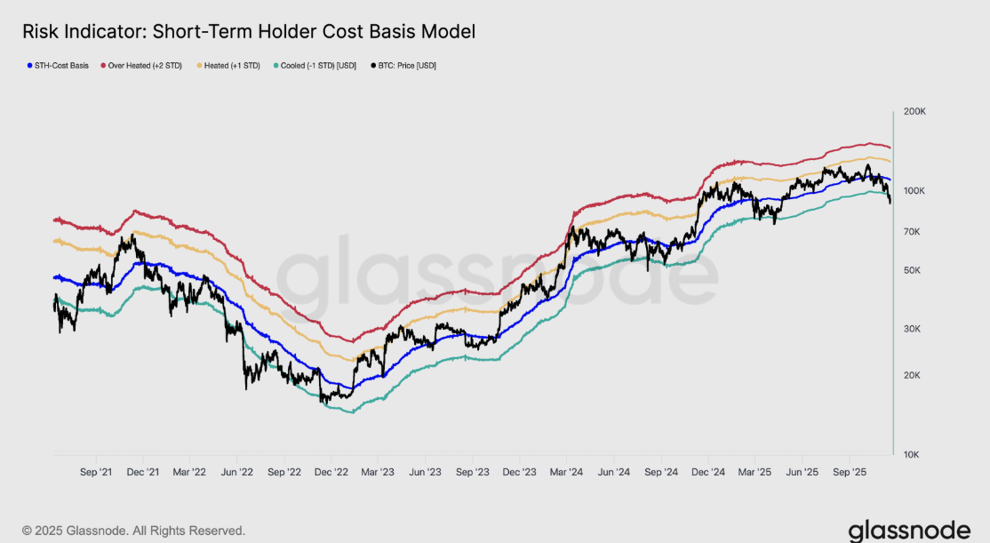 Glassnode在週三的週報中強調,比特幣市場結構發生了明顯變化,跌破97,000美元的關鍵支撐位。BTC隨後暴跌至89,000美元,創下新低,低於相對於短期持有者(STH)成本基礎的一個標準差帶(95,400美元),目前接近109,500美元,如下圖所示。