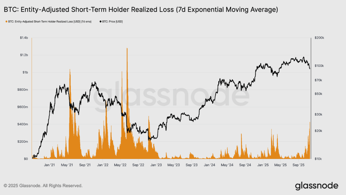 報告進一步解釋了投資者放棄的急劇上升。這是自2024年初以來,BTC第三次跌破STH成本基礎模型的下限,但痛苦的程度顯著更大。短期持有者實現損失的7天EMA已飆升至每日5.23億美元,為FTX崩潰以來的最高水平。