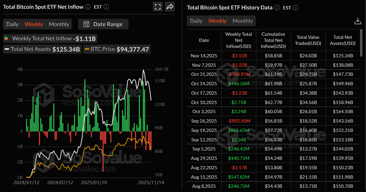 比特幣(BTC)價格在週一寫作時找到約94,253美元的關鍵支撐位,此前在前一週修正近10%。機構需求持續減弱,因為美國上市的現貨比特幣交易所交易基金(ETF)在過去一週記錄了超過10億美元的流出。分析師警告,儘管可能會出現短暫反彈,但在投資者信心減弱的情況下,整體牛市週期似乎越來越脆弱。