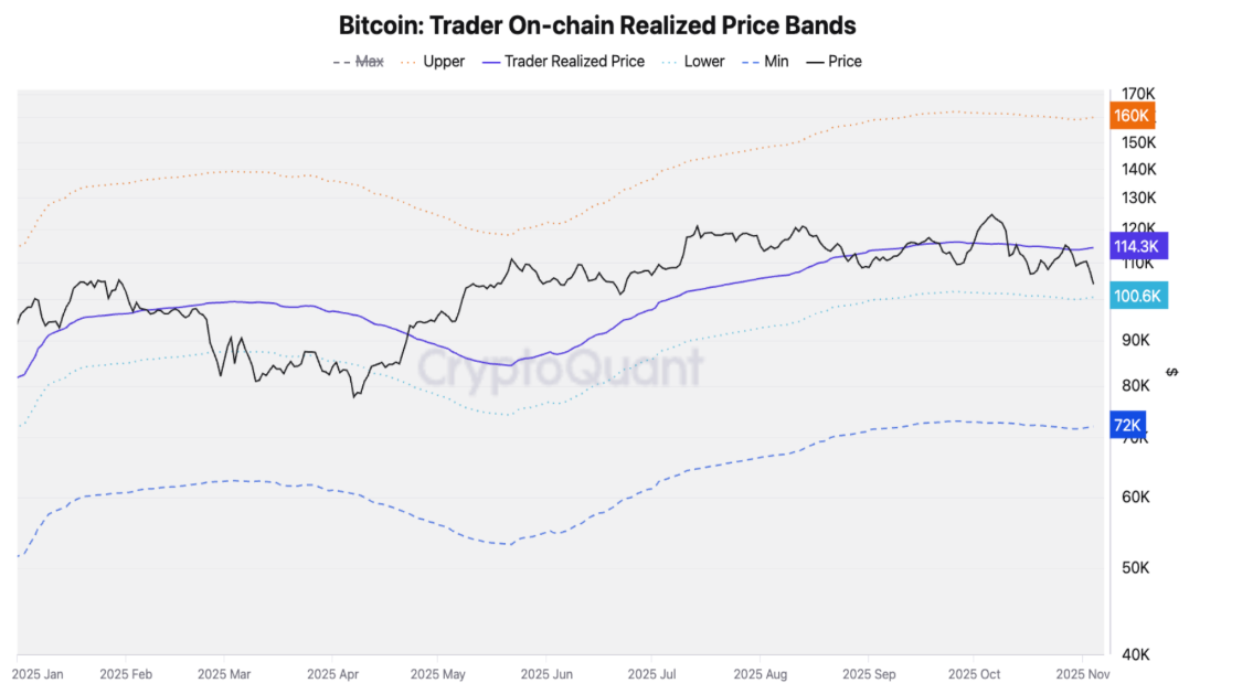 在本輪牛市周期中,下軌(100,000美元)一直充當支撐位,因為交易者往往在此水平附近賣出並實現虧損,根據交易者鏈上實現價格區間指標的數據顯示。然而,如果足夠的賣壓積聚,下一支撐位將是交易者的最低價格區間,目前為72,000美元。