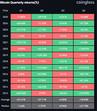 進一步增加這種樂觀情緒的是,第四季度(Q4)通常是比特幣表現最好的季度,平均回報率為78.03%,這可能會推動比特幣在年底前創下新高。