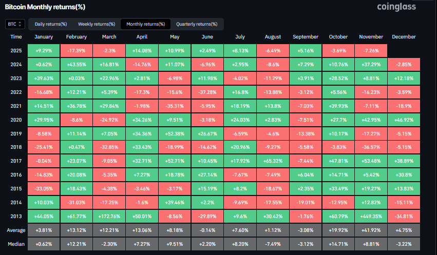 CoinGlass的歷史數據表明,儘管比特幣在10月錄得3.69%的損失——讓期待"上漲十月"的交易者失望——但歷史上11月一直是比特幣表現最強的月份,平均回報率為41.92%。