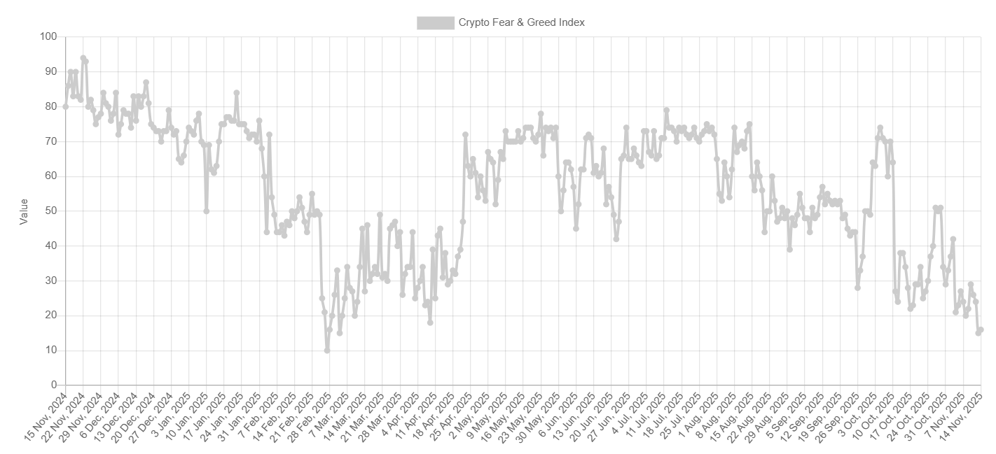 恐懼與貪婪指數在週五降至16,接近3月初的低點,表明市場參與者在準備迎接進一步下行時,情緒急劇轉向極度恐懼。
