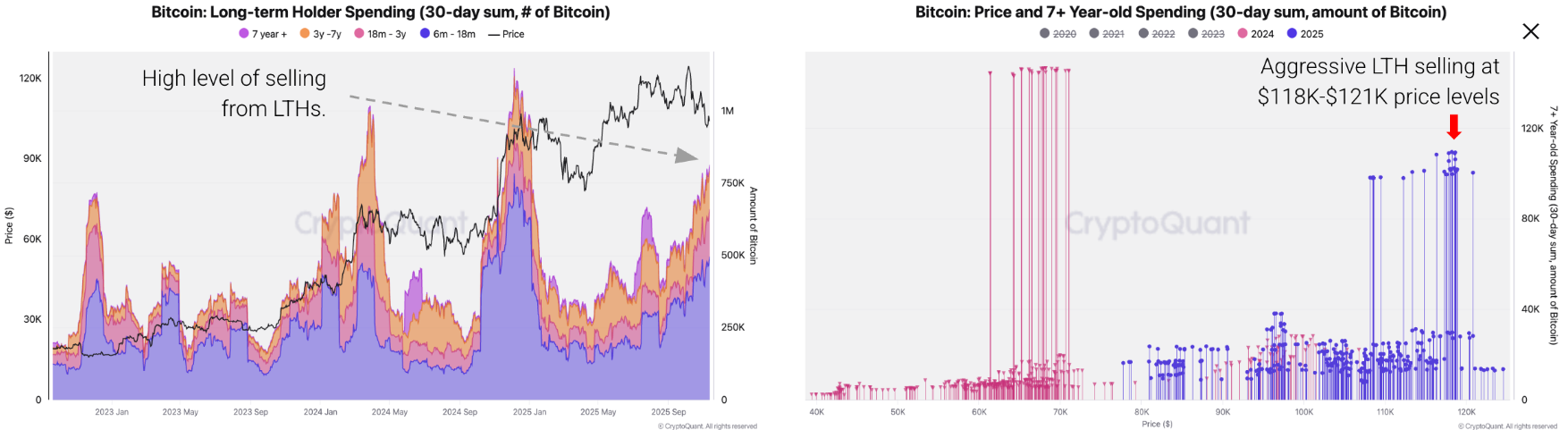 此外,長期持有者(LTHs)在過去30天內共售出815,000 BTC,為2024年1月以來的最高水平,給價格帶來了下行壓力。這一拋售發生在現貨需求減弱/收縮的時期,表現為比特幣ETF的淨流出、負的Coinbase價格溢價以及明顯需求的收縮。在之前的高LTHs銷售階段,需求足夠強勁以在更高價格吸收這些供應,但目前情況並非如此。LTHs在118,000美元和121,000美元的價格區間內進行了激進的拋售。