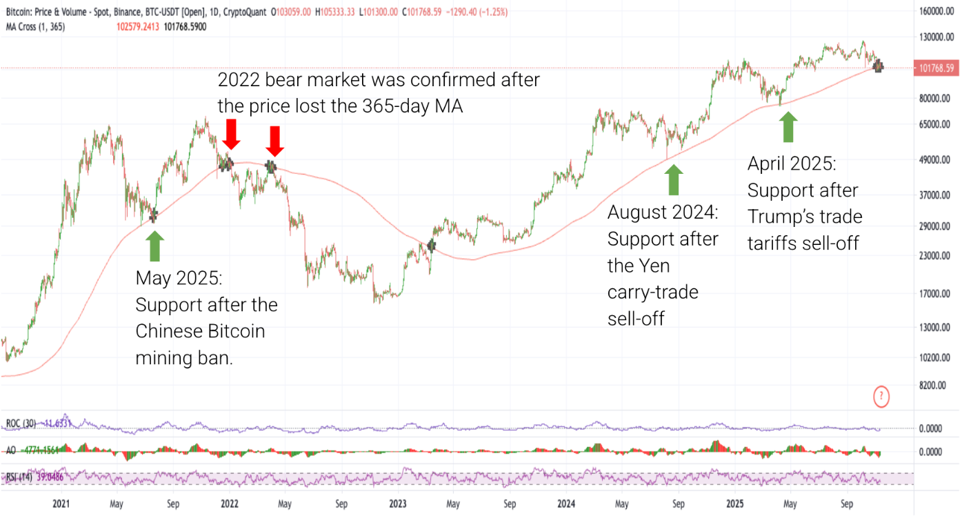 報告總結稱,365天移動平均線(MA)約在102,000美元是關鍵的技術和心理支撐位,因為它在本輪牛市周期中一直充當支撐位(下圖中的綠色箭頭),並且是2021年12月至2022年1月熊市開始時觸發的最後一個信號。未能重新奪回365天MA可能會加速更深的修正。值得注意的是,比特幣在當前期間多次收於365天MA以下,這在本輪牛市中尚未發生。如果出現足夠的拋售壓力,下一支撐位將是91,000美元的2倍Metcalfe網絡價值區間和72,000美元的交易者最低價格區間。