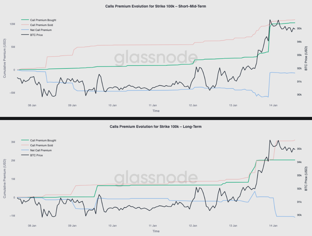 下面的Glassnode圖表顯示了圍繞$100K行使價的期權流動,表明交易者增加了看漲期權的購買,而看漲期權的賣出活動趨於穩定。這推動了看漲期權的溢價上漲,顯示出對短期上漲敞口的強烈需求。