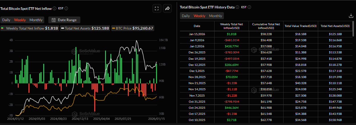 本週比特幣價格的反彈得到了日益增長的機構需求的支持。下面的SoSoValue圖表顯示,現貨比特幣交易所交易基金(ETF)截至週四錄得淨流入18.1億美元,這是自10月初以來的最高週流入,當時BTC達到了126,199美元的新歷史高點。如果這些流入繼續並加劇,BTC可能會朝著100,000美元的心理關口反彈。