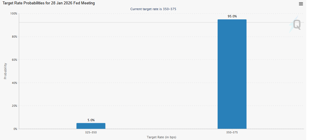 CME FedWatch工具顯示,市場參與者目前預計美聯儲在1月27日至28日的會議上維持利率不變的概率超過95%。