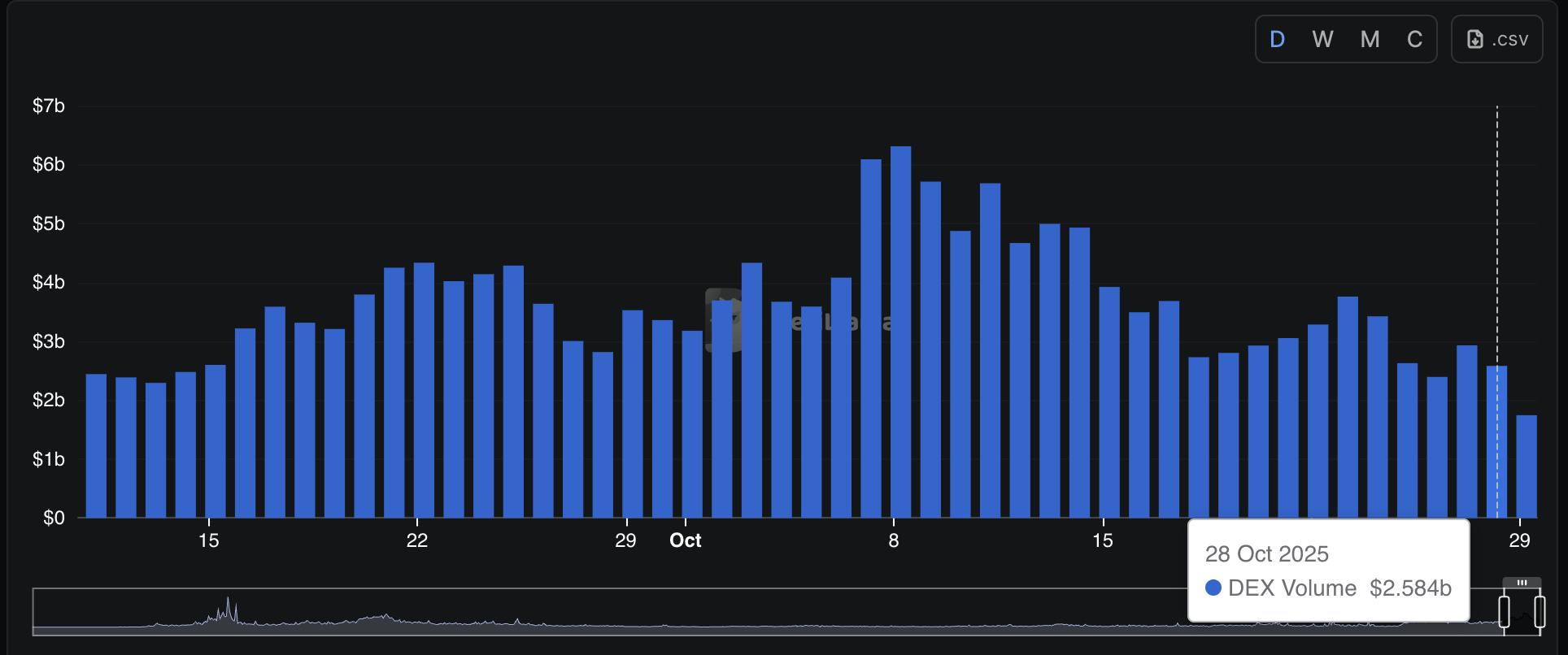 根據DeFiLlama的數據,去中心化交易所(DEXs)的交易量在週二降至$25.84億,較10月8日的$63.13億高點下降,表明鏈上流動性低迷。
