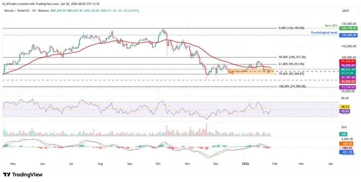比特幣價格小幅回升,週一收於水平平行通道的中點 87,787 美元,經過上週 7.48% 的修正。BTC 在週二繼續復甦,找到支撐在中點水平。週三的報導時間,BTC 交易價格為 89,300 美元。如果 87,787 美元繼續作為支撐,BTC 可能會向水平模式的上邊界 90,000 美元延續反彈。