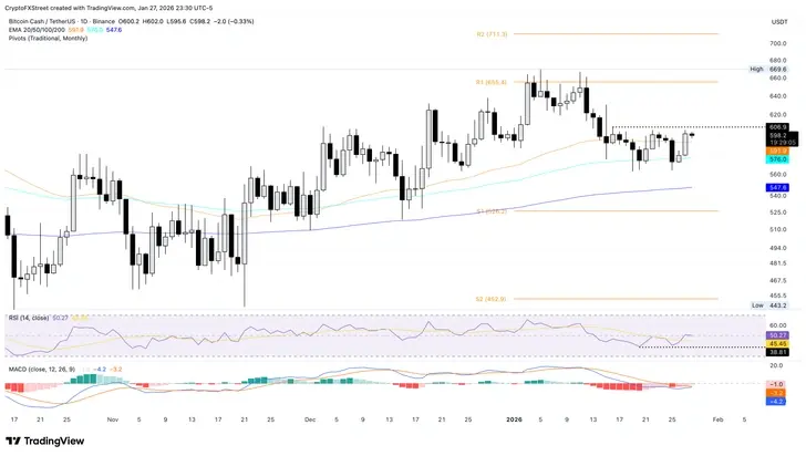 比特幣現金(BCH)在週三的報導時間交易價格約為600美元,日圖上形成潛在的雙底反轉。BCH 代幣在積極的資金費率周期中見證了期貨合約的資本流入,表明投資者興趣的恢復。從技術上講,如果比特幣現金能夠維持動能,可能會反彈至655美元。