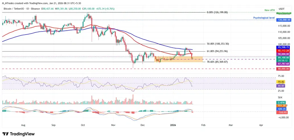 比特幣價格在週日收於61.8%斐波那契回撤位(從4月低點74,508美元到10月歷史高點126,199美元)下方,報94,253美元。BTC在接下來的兩天內下跌5.79%,收於關鍵支撐位下方:50日指數移動平均線(EMA)在92,118美元和之前突破的上方整合邊界在90,000美元。截止週三,BTC在重新測試水平平行通道中點87,787美元後略有反彈。