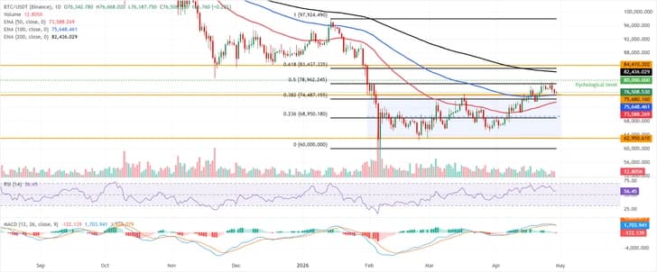 比特幣價格週三交易於76,508美元,保持建設性看漲偏向,因其位於約73,588美元和75,648美元的50日及100日指數移動平均線(EMA)之上,並且已突破平行通道上邊界附近的75,680美元。相對強弱指數(RSI)約為56,顯示適度正向動能,儘管移動平均收斂背離指標(MACD)已回落至零以下,暗示隨著價格接近密集的上方阻力帶,上漲動力可能放緩。