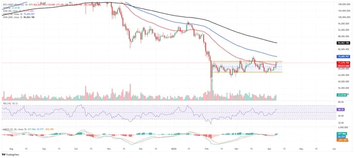 比特幣價格週三交易於71,600美元,較前一日上漲超過4%。BTC維持在以72,600美元為上限的通道上半部,保持溫和看漲的短期偏向,處於更廣泛的調整結構內。BTC已重新站上50日指數移動平均線約70,500美元,將其轉化為動態支撐,並與移動平均線趨同/背離(MACD)柱狀圖的改善趨勢相符,MACD線已上穿信號線,且兩者均徘徊於零軸附近。相對強弱指數(RSI)約為58,仍高於中線,表明買方保持動能。