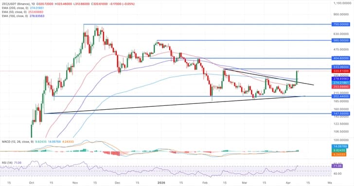 Zcash在週三新聞發布時繼續上漲,價格超過300美元,此前一天漲幅達27%。短期偏向看漲,因價格突破了100日和200日指數移動平均線(EMA)的交匯點,二者均遠低於市場價格,強化了新興的上升趨勢。動量指標確認了這一轉變,移動平均線趨同/背離(MACD)指標現已明顯轉正,且其線位於信號線之上,同時相對強弱指數(RSI)維持在71附近,儘管進入超買區,但顯示出強勁的上行壓力。