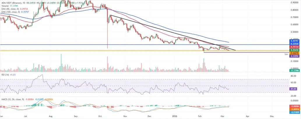截至週一,卡爾達諾(ADA)價格為0.25美元,上週下跌近9%。持續的地緣政治衝突抑制了整體風險情緒。鏈上和衍生品數據支持負面前景,未平倉合約(OI)和每日活躍地址下降,表明投資者參與度減弱。在技術方面,動量指標發出看跌趨勢信號,暗示未來可能出現更深的修正。