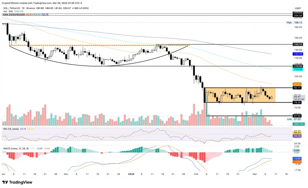 截至週一,比特幣價格為66,300美元。短期偏向輕微看跌,價格在平行通道內交易,接近下邊界,未能維持在70,000美元區域之上。加密之王仍遠低於50日和100日指數移動平均線(EMA),這些均線持續向下傾斜並限制整體趨勢,強調下行壓力。