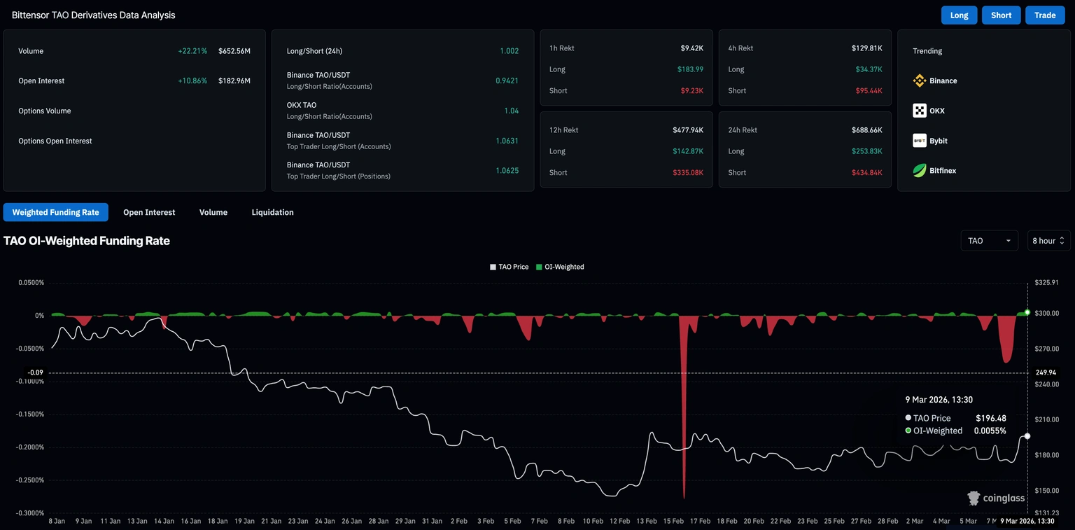 Bittensor(TAO)在週一撰寫時上漲8%,逐漸接近200美元大關。衍生品數據顯示,TAO期貨未平倉合約激增,反映出市場對進一步恢復的預期。TAO的技術前景混合,因為看漲動能的上升在200美元附近面臨阻力。