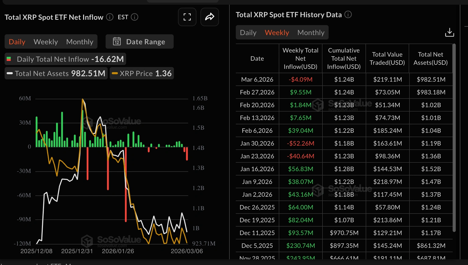 瑞波幣(XRP)在週一撰寫時保持在1.35美元以上,因為全球市場繼續消化中東戰爭的影響。上週,該匯款代幣面臨顯著的資本外流,反映出持續的風險規避情緒。此外,XRP的零售興趣仍然較低,給價格帶來壓力。