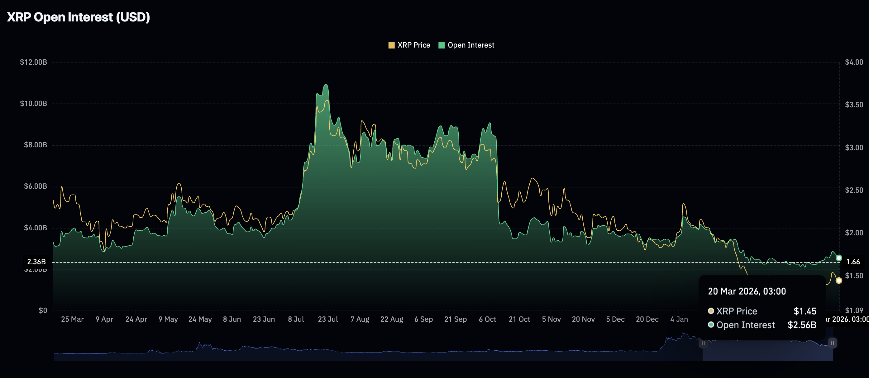 瑞波幣衍生品市場面臨散戶興趣低迷,期貨未平倉合約(OI)反映了未結期貨合約的名義價值,週五降至25.6億美元,較前一日的26.7億美元有所減少。