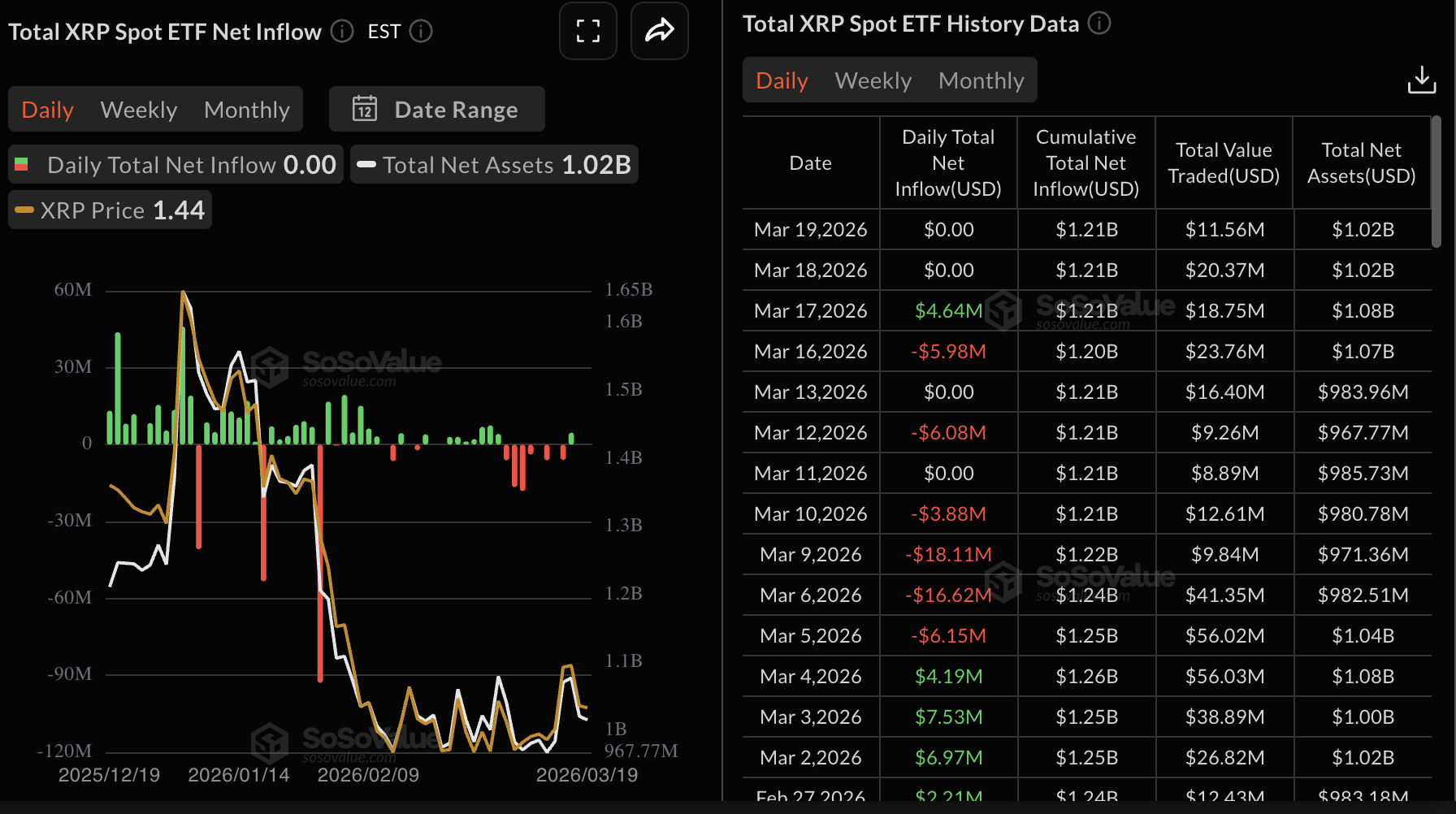 與此同時,根據SoSoValue數據,瑞波幣現貨ETF在週三和週四的活動保持低迷,資金流入為零。累計資金流入保持在12.1億美元,管理資產淨值平均為10.2億美元。低迷的活動削弱了機構對瑞波幣的興趣,可能影響市場情緒並延緩價格回升。