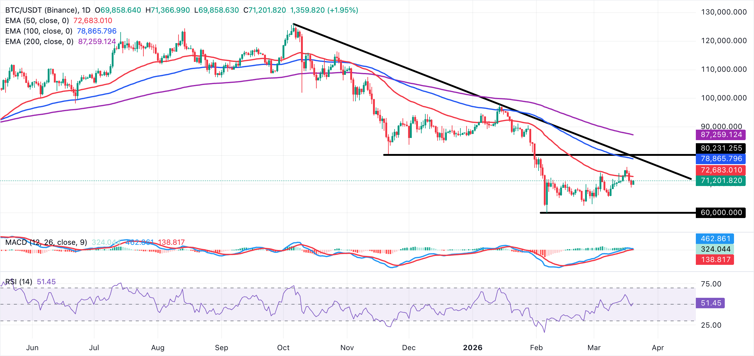 下方方面,短期支撐位於70,200美元附近,緊接著是68,795美元,此處為之前的反應低點聚集區,買家近期曾守住該跌勢。更深的回調將暴露65,822美元,即3月9日的低點。