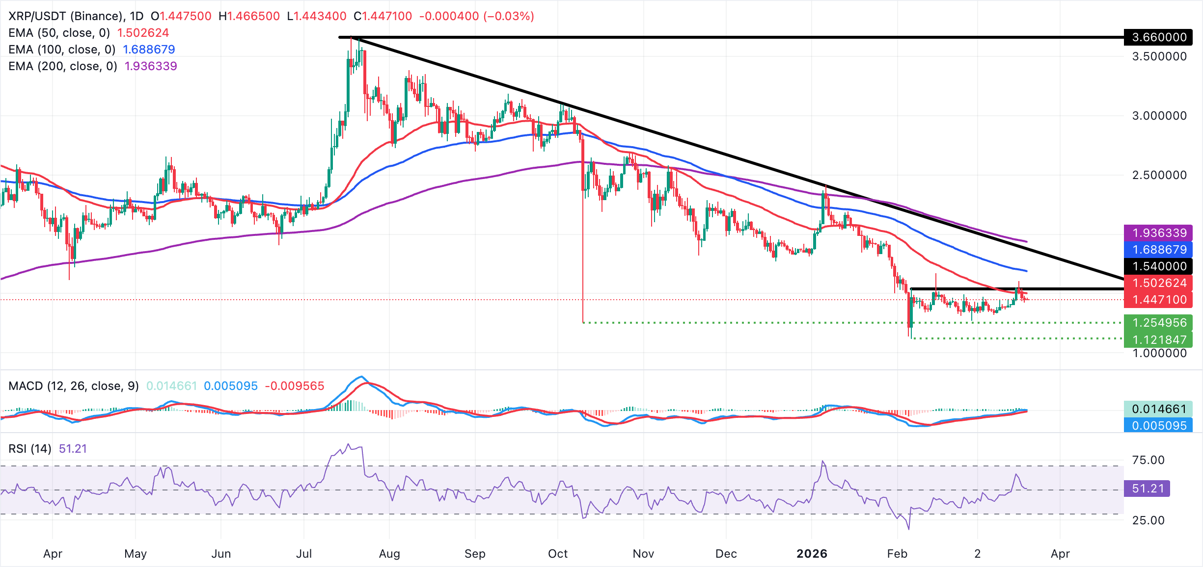 至於瑞波幣,短期偏向中性,略帶看漲傾向,因該幣在1.42美元區域反彈。該代幣遠低於自3.66美元高點以來限制每次反彈的下降阻力趨勢線,儘管近期有所回升,但整體結構仍屬調整性質。