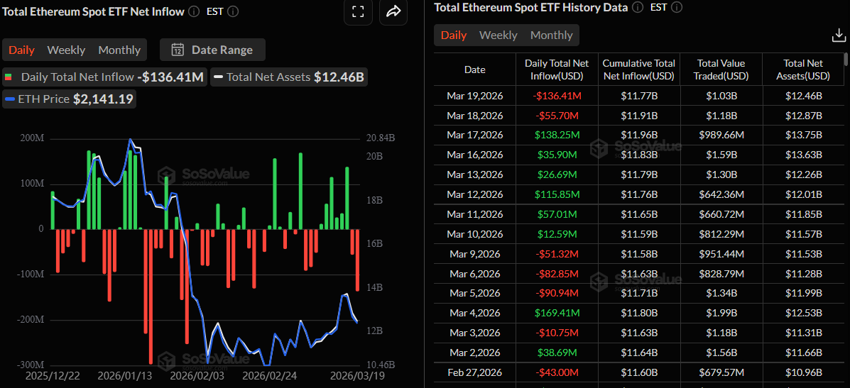 初步阻力位於50日EMA附近的2,212美元,其次是近期反應高點2,386美元。若日線收盤價突破2,386美元,將打開通往100日EMA 2,495美元的路徑。下方方面,以太坊正在測試2,130美元區域的支撐,該區域曾限制2月份的漲勢。進一步支撐位於最新擺動低點區域的2,050美元,隨後是1,750-1,800美元附近的強勁需求區,即近期反彈的基底。跌破1,750美元將削弱初現的看漲傾向,並暴露更深的回調風險,符合更廣泛的看跌結構。