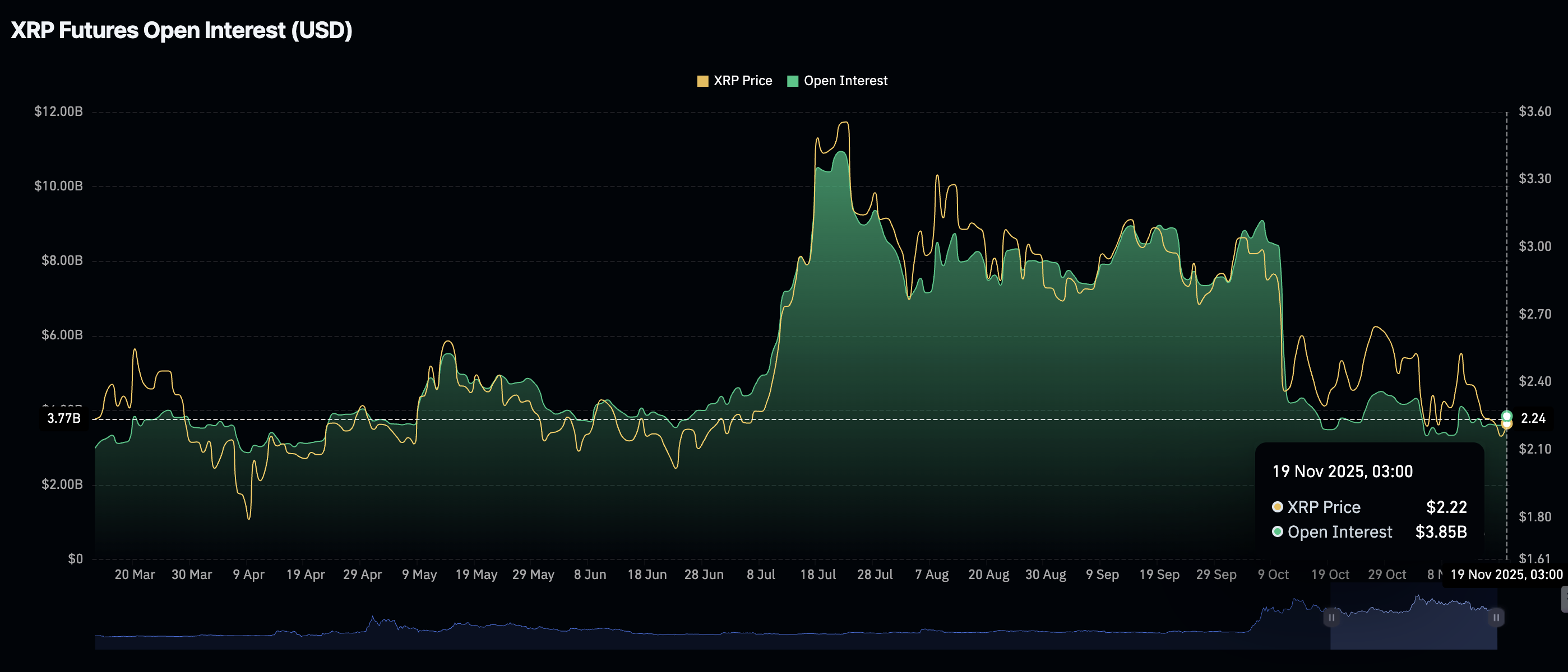 CoinGlass關於XRP衍生品市場的數據表明,週三的期貨未平倉合約(OI)平均為38.5億美元,較週二的36億美元略有上升,但顯著低於11月1日記錄的41.7億美元。