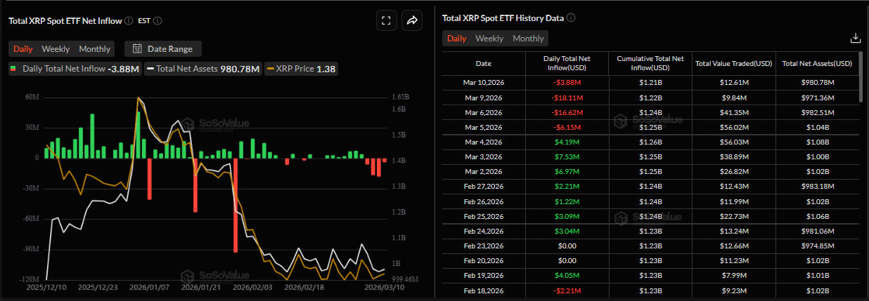 本週迄今為止,XRP的機構需求仍然疲軟。SoSoValue數據顯示,現貨XRP ETF在週二錄得388萬美元的輕微流出,標誌著自3月5日以來連續第四天提款。如果這些趨勢繼續並加劇,XRP可能在接下來的幾天內出現修正。
