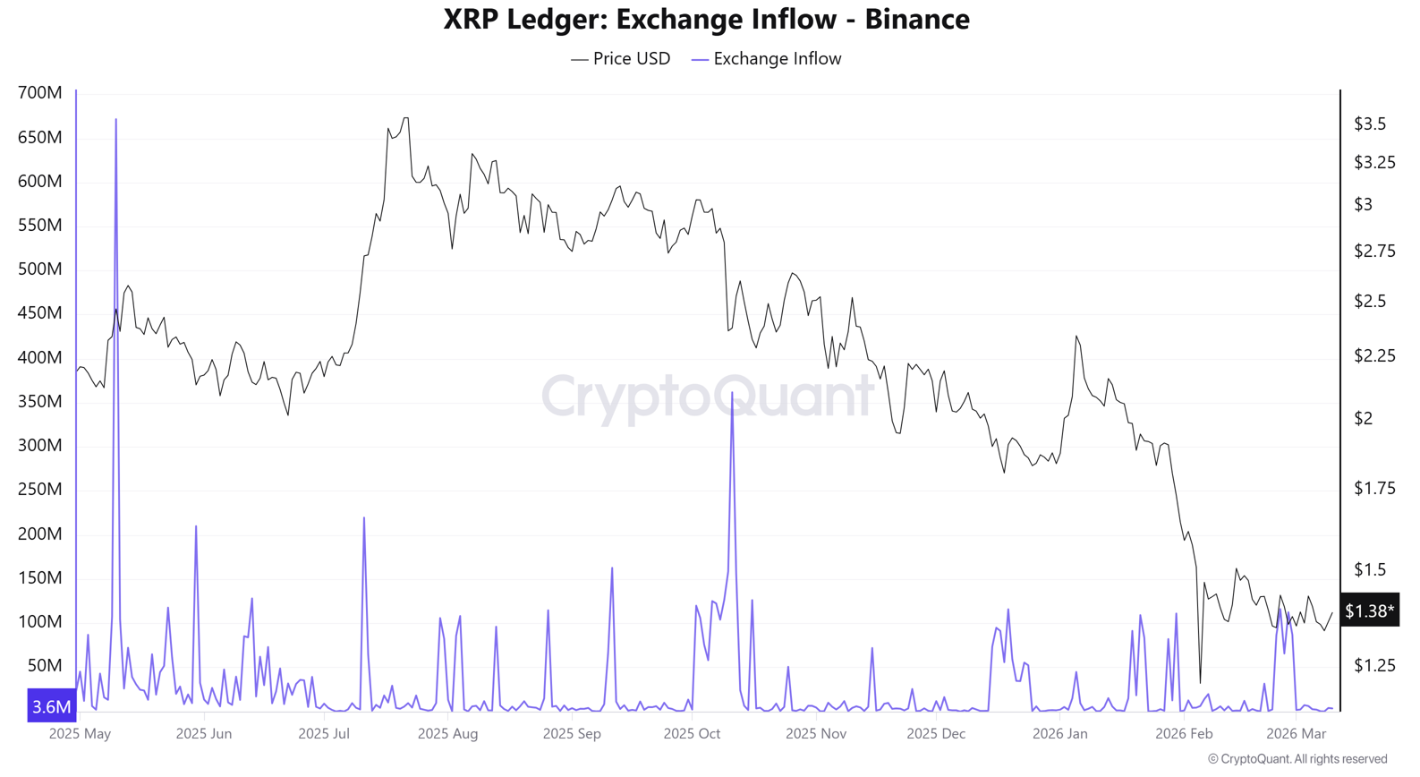 此外,XRP流入Binance的資金在2025年5月10日和10月11日的兩次大幅激增後暴跌。流入量已降至僅362萬XRP,遠低於5月的672百萬和10月的362百萬,表明交易所的賣壓顯著減輕。