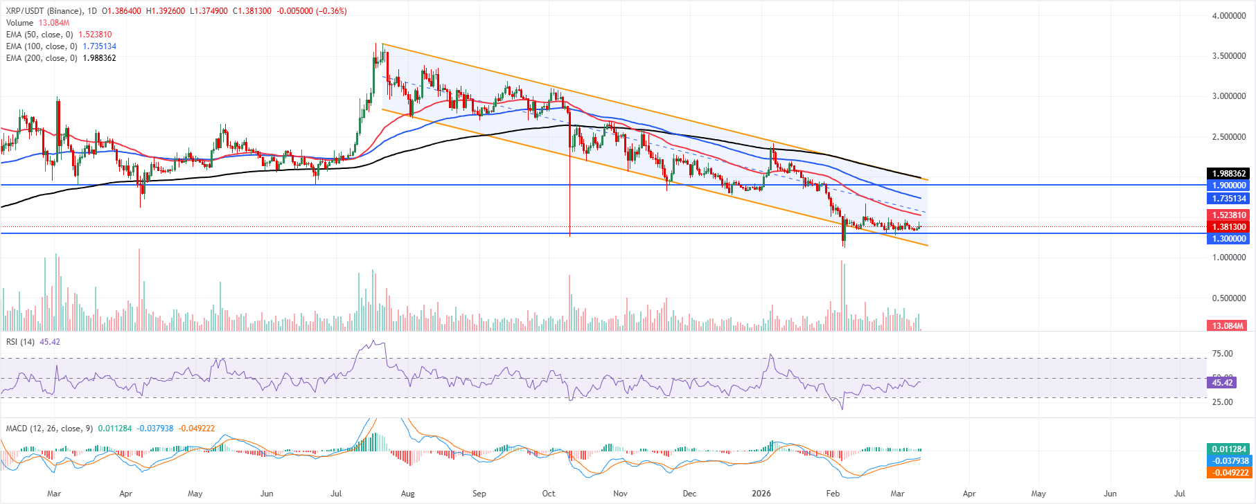 週三XRP交易價格為1.38美元,本週迄今上漲近3%,但當天略有下跌。XRP保持在一個下降平行通道內,該通道自2.80美元以上以來引導市場走低,儘管最近穩定在1.35美元以上,但整體短期基調仍然看跌。