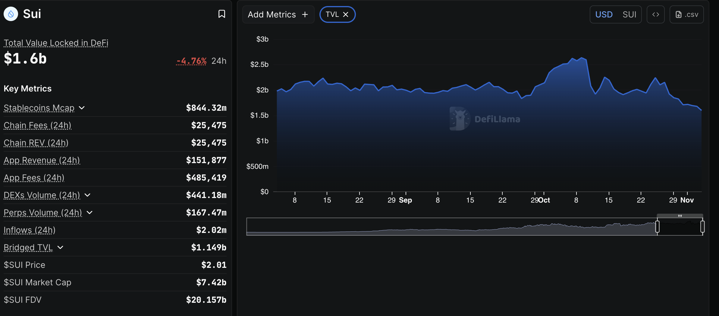 - 過去24小時內下跌5%使SUI的DeFi TVL降至16億美元。