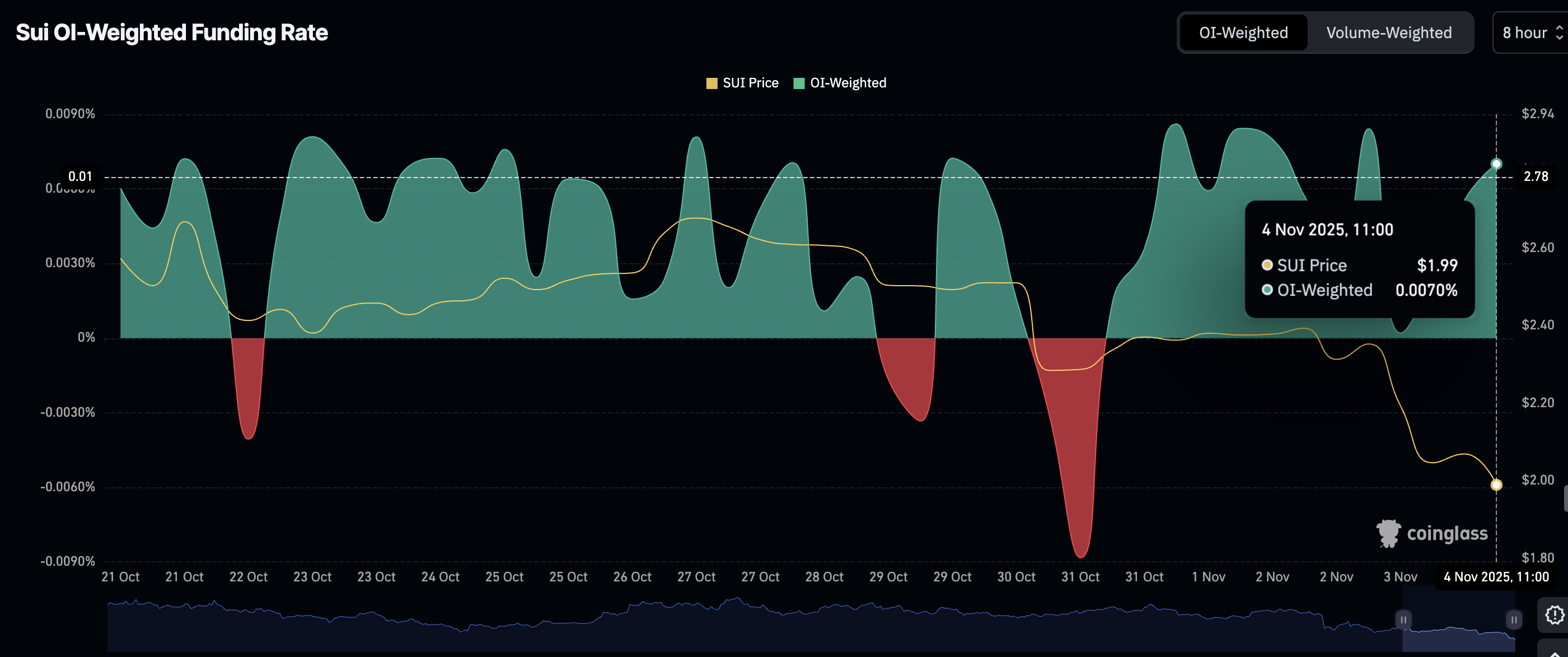儘管如此,投資者似乎仍在通過衍生品市場尋求敞口,未平倉合約加權資金費率從週一的0.0002%上升至0.0070%。這一指標的穩步上升表明,交易者看到新的機會出現,因為SUI的價格徘徊在$2.00的支撐位上方。